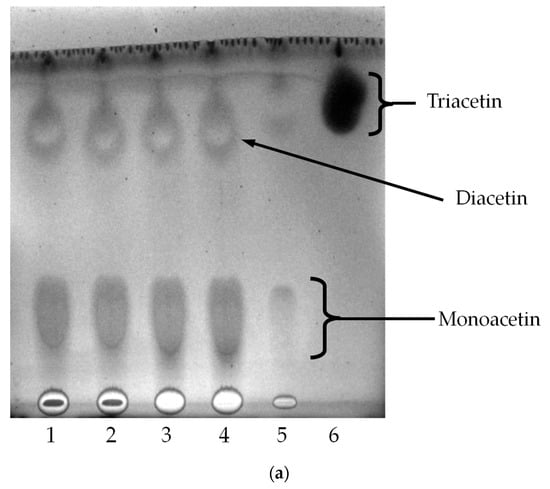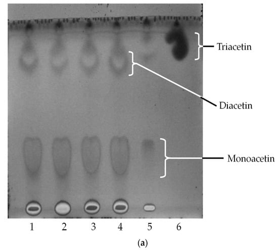Figure 6a shows the time course profile of direct esterification of glycerol with acetic acid (molar ratios of 1:9) using ScLipB. Triacetin (Nacalai Tesque, Kyoto, Japan) was used as a control. Similar with ScLipA, ScLipB also esterified glycerol forming monoacetin and diacetin from Day 1–4; while triacetin was formed only on Day 5, with a reduction in the intensity of monoacetin spot. Liao et al. [] were able to obtain 100% triacetin conversion with the same molar ratio using Amberlyst A-35 at 105 °C for 4 h. They also stated that the glycerol conversion increased with the increase of temperature and molar ratio []. Conversely, this study took on a more subtle approach, using lipase at 30 °C.