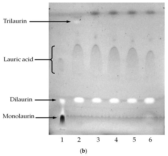 TLC was recommended for qualitatively screening enzymatic TAGs hydrolysis reactions []. As a result of their affinity to a variety of substrates, lipases possess specific characteristics for producing different products []. Direct esterification of glycerol with acetic acid was carried out with ScLipA in a solvent free system with the molar ratios of 1:9, and the results were evaluated using TLC. Figure 5a shows the time course profile of direct esterification of glycerol and acetic acid using ScLipA and triacetin (Nacalai tesque, Kyoto, Japan) was used as a control. It can be seen that glycerol was esterified to form monoacetin and diacetin from Day 1–4; while triacetin was formed on Day 5 with a reduction in the intensity of monoacetin spot. As for lauric acid, monolaurin was synthesized on Day 1 as in Figure 5b Lane 1. Trilaurin can be observed on Day 2 for the molar ratios of 1:3 (glycerol:lauric acid); however, the trilaurin produced was degraded subsequently, as shown in Figure 5b Lanes 3–5. Hydrolysis and esterification are reversible in lipase reaction [], where the water produced during esterification of lauric acid was most probably involved in the hydrolysis of trilaurin back to its original state, which is caused by the affinity of ScLipA to hydrolyze MCTG. To ensure the reaction move towards the esterification process, water must be kept at a minimum amount or totally removed. This was also supported by Rosu et al. [], who stated that water removal during reaction is very important for moving the reaction equilibrium towards esterification processes. Esterification of lauric acid and glycerol (molar ratio of lauric acid/glycerol of 3) with 9% Lipozyme IM 20 at 80 °C was conducted by Langone and Sant’ Anna, Jr. []. They found that 75% of trilaurin was produced after 26 h of incubation. Conversely, this study showed that trilaurin can be produced by Day 2 using 4% partial purified lipase at 30 °C; as the enzyme is more stable at this temperature. As for direct esterification of glycerol and oleic acid, ScLipA did not show any triolein production (results not shown).