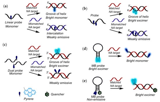 Schematic representation of principles of some pyrene-modified fluorescent probes: linear probes (a,b); dual probes (c); and molecular beacons (MBs) (d,e).