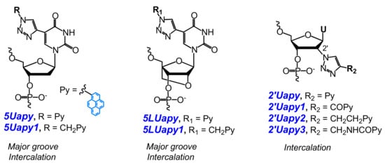 For instance, Hrdlicka and coauthors used CuAAC in presynthetic strategy for the preparation of triazole-linked C5- or C2′-pyrene-functionalized monomers shown in Figure 4 [69,70,71,74]. An incorporation of C5-pyrene-functionalized monomers 5Uapy, 5Uapy1, and their LNA analogues 5LUapy and 5LUapy1 into DNA showed trends to destabilize nucleic acid duplexes [69,71,74]. C5-pyrene-functionalized oligonucleotide probes demonstrated significant hybridization-induced increases in fluorescence spectra and enabled efficient fluorescence discrimination of SNPs for both types of NA targets. The pyrene moiety is presumably positioned in the major groove. It is highly emissive when the probes are bound to fully complementary targets whereas, in the case of mismatched targets, pyrene tends to intercalate into the duplex [69,74]. These remarkable properties of C5-pyrene-functionalized monomers were utilized to construct a probe with four consecutive incorporations of monomer 5Uapy in the center, which possesses high affinity and specificity to RNA targets due to the formation of the pyrene π-stack array in the major groove of the duplex. This probe demonstrates exceptional SNP-discriminating properties upon thermal melting of the duplexes [71]. Oligodeoxyribonucleotides modified with C2′-pyrene-functionalized monomers 2′Uapy–2′Uapy3 (Figure 4) displayed slightly decreased thermal stability of NA duplexes, and high affinity toward DNA targets with the abasic site located opposite to the monomer site. They are also universal hybridization probes, i.e., probes that have nearly identical affinities toward fully-matched and mismatched RNA/DNA. Physicochemical studies suggest that the pyrene moiety is intercalating into the duplex, whereby the opposing nucleotide is pushed out [70].