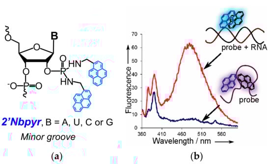 The first variant, linear 2′-O-methyl RNA probes containing one to three 2′-bispyrene-modified monomers (Figure 6) were found to be RNA-specific fluorescent probes [82,83]. In general, the probes, being much more synthetically accessible, demonstrated similar properties that were observed for other variants of probes comprising monomers with pyrene introduced to the 2′-position of ribose through a short linker, indicating the disposition of pyrenes in the minor groove of the RNA duplex. Namely, introduction of the 2′Nbpyr monomers (Figure 6a) decreased the thermal stability of duplex probes with RNA targets and, depending on the nucleotide context, had different effects on duplexes with DNA, whereas significant increases (up to 21-fold) in pyrene excimer fluorescence intensity were observed upon binding of most of the 2′-bispyrene-modified probes with complementary RNA (Figure 6b), but not with DNA. We found that the fluorescent properties of the probes upon hybridization with RNA depended on the nucleotide context of the modified ribonucleoside and were optimal in the case of 3′-flanking CC, CG, or UC dinucleotide units [83].