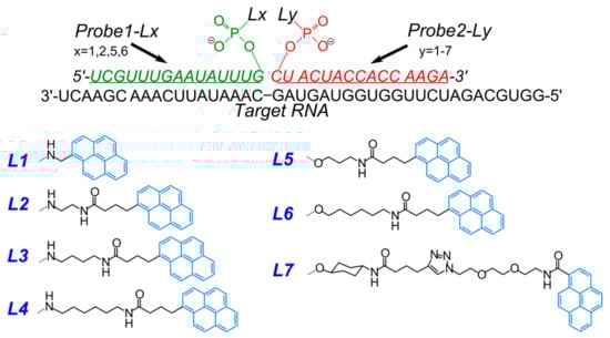 Schematic representation of the RNA targeted excimer-forming dual probes studied in [84]. Probe1-Lx and Probe2-Ly represent components of dual 2′-O-methyl RNA probes bearing a pyrene residue attached to the 3′- and 5′-end (Lx and Ly, respectively) via linkers of different lengths and structure.