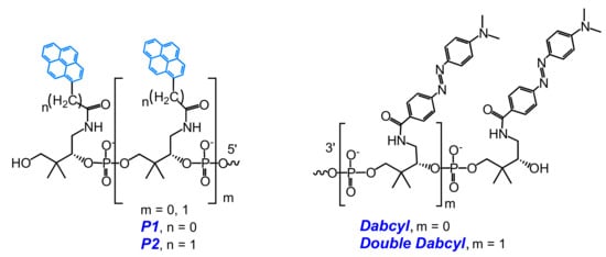 Recently, Korshun and coauthors developed a number of new MBs (types MB1a and MB1b) labeled with one or two non-nucleoside pyrene monomers P1 and/or P2 and one or two moieties of Dabcyl quencher (units Dabcyl and Double Dabcyl) [105] (Figure 10).