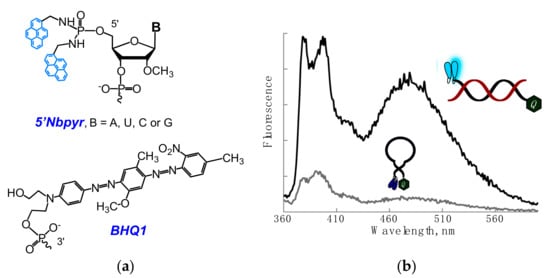 New excimer-forming 5′-bispyrene-modified molecular beacons (type MB1a) for the detection of RNA targets were designed in [85]. The probes are 2′-O-methyl RNAs containing a 5′-bispyrenylmethylphosphorodiamidate group (bispyrene group) at the 5′-end (5′Nbpyr monomer) and a fluorescence quencher (BHQ1) at the 3′-end (Figure 11a). The incorporation of a pyrene moiety was performed with the use of simple and efficient postsynthetic method of modification via the Mukaiyama reaction with nucleophilic catalysis according to [86,87].