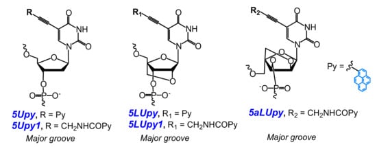 Hrdlicka and coauthors studied a series of nucleobase-modified monomers comprising pyrene attached through alkynyl linkers (Figure 12 and Figure 13). They hypothesized that the introduction of the pyrene moiety via rigid linkers would result in the disposition of pyrene in the major groove of the NA duplex of the modified probe with the target and provide them with SNP discrimination properties. The probes (Figure 1a) comprising C5-alkynyl-functionalized monomers based on DNA (5Upy and 5Upy1) [113,115], LNA (5LUpy and 5LUpy1) [74,113], or α-L-LNA (5Upy and 5aLUpy) (Figure 12) [113,114] have shown almost the same tendencies in physicochemical properties, such as an increase in fluorescence intensity upon hybridization to the NA target and excellent fluorescent discrimination of mismatched DNA targets, although in the case of the probes modified by LNA monomer 5LUpy1 these characteristics were more pronounced.