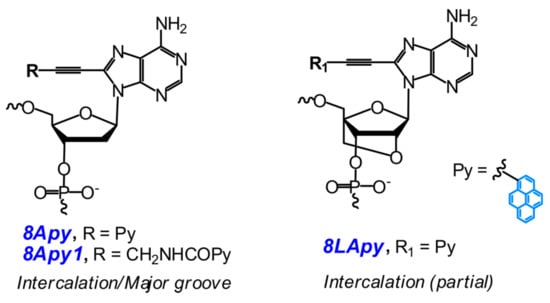 In contrast, C8-alkynyl-functionalized monomers 8Apy, 8Apy1, and 8LApy (Figure 13) were shown to be detrimental to the binding affinity and specificity [115,117]. Significant improvement of binding affinities and fluorescent discrimination of SNPs in DNA targets of the probes containing monomers based on DNA 5Upy and 5Upy1 have been achieved by the introduction of LNA nucleotides as direct neighbors flanking the C5-alkynyl-functionalized monomers [115,116]. Previously, this strategy has already been successfully applied to improve properties of pyrene-modified probes in [48,90,118].