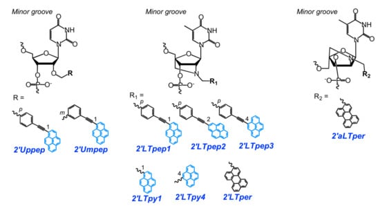 Structures of 5′-mono-(5′Nmpyr), 3′-mono-(3′Nmpyr), and bispyrene-modified (3′Nbpyr) nucleotides [91,120,121], and pyrene-modified monomer (2Npyr) [122].