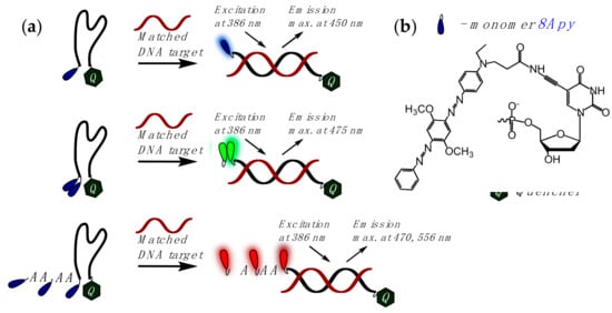In an interesting SNP typing approach described in [123], one or more insertions of monomer 8Apy (Figure 13) were incorporated at the 5′-end of a folded DNA probe containing a quencher of fluorescence at the 3′-end (Figure 16). Upon hybridization with the DNA target the probes exhibited a fluorescent signal of three different colors, namely blue, green, and red, based on number of 8Apy monomers in the probe (one, two, and three, respectively), and could discriminate the fully-matched DNA target from one or two base-mismatched targets.