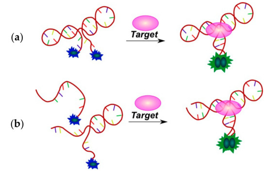 Immunoglobulin E is considered to be an attractive target for aptamer selection and design of aptamer-based detection assays [126]. A multi-component system constructed for the IgE detection was reported in [143] (Figure 18c). After incubation of the anti-IgE aptamer with the target, a monopyrene-modified G-rich probe complementary to the aptamer sequence and able to form an intermolecular parallel tetrameric G-quadruplex was added. The probe forms a duplex with the free aptamer, but not with the target-bound one. Unbound probe molecules form a quadruplex, and after specific S1 nuclease DNA digestion, pyrene is liberated, so monomer fluorescence arises.