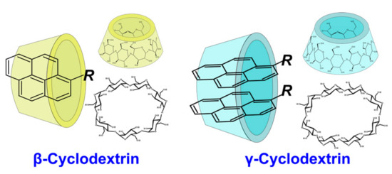 The third strategy implies the use of cyclodextrin to enhance the pyrene fluorescence [144,145,146,147]. Extensive studies have documented that the truncated, corn-shaped hydrophobic cavity of cyclodextrin (CD) can selectively bind diverse organic molecules to form a versatile supramolecular assembly (Figure 19).