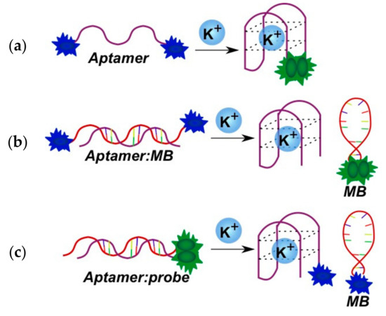 Aptamer-based systems for potassium ion detection. (a) Bispyrene-labeled aptamer; (b) bispyrene-labeled probe (molecular beacon); and (c) monopyrene-labeled aptamer and probe.
