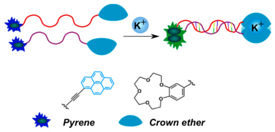 Another system for the detection of potassium ions is built of two complementary monopyrene-labeled oligonucleotides that exhibit pyrene excimer fluorescence when the duplex is assembled [155]. Two crown ether moieties are at the opposite termini of the duplex, binding potassium ions (Figure 23). This duplex is stable only in the presence of potassium ions, which permits their detection by the excimer fluorescence signal.