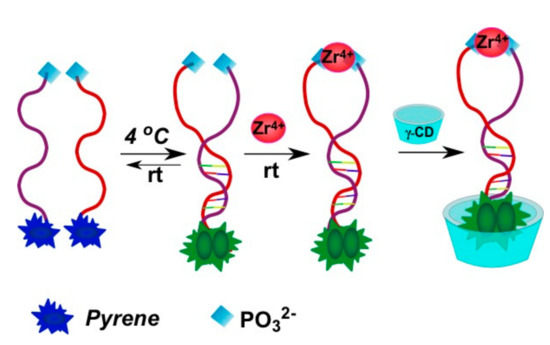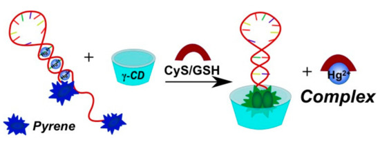 A γ-CD-mediated dual pyrene-labeled stemless molecular beacon (γ-CD-P-MB) was constructed by bounding the bispyrene labeled DNA probe in the γ-CD hydrophobic cavity [147]. By introducing γ-CD amplification, the two pyrene molecules are hosted within the γ-CD cavity to trigger remarkable excimer fluorescence enhancement. γ-CD/pyrene bounding interaction also allows tuning the stem stability of the probes, thereby achieving higher target-binding selectivity and sensitivity than conventionally-structured DNA probes. The γ-CD-P-MB avoids any variation of the stem length and sequences, which eliminates restrictions on probe design. In addition, the Stokes shift (about 130 nm) and long fluorescence lifetime (about 40 ns) of the pyrene excimer (λex = 344 nm, λem = 475 nm) prevents background interference, such as autofluorescence from biological environments, thus providing an opportunity for the detection of targets from complex biological media. Such systems were applied for DNA detection [147,148] and SNP [95]. Bispyrene-labeled aptamers were used for thrombin [147] and ATP [145] detection in the presence of γ-CD (Figure 20).