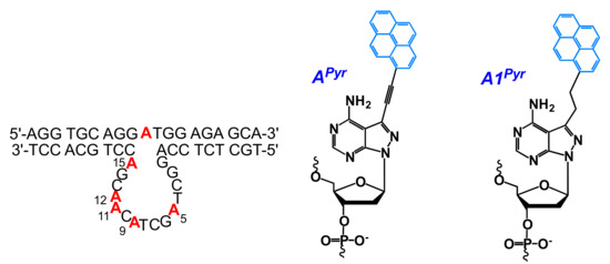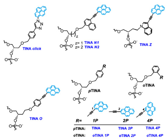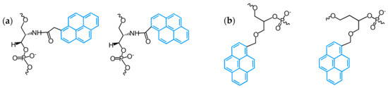 A large diversity of the pyrene-modified nucleotide monomers obtained through presynthetic [69,70,71,72,73,74,75] or postsynthetic [76,77,78,79,80,81] conjugation of pyrene derivatives with modified nucleotides or oligonucleotides via Cu(I)-catalyzed azide alkyne Huisgen 1,3-dipolar cycloaddition (CuAAC) has been reported over the past several years.