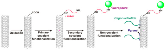 - Permyakova, E.S.; Novopashina, D.S.; Venyaminova, A.G.; Apartsin, E.K. Non-covalent anchoring of oligonucleotides on single-walled carbon nanotubes via short bioreducible linker. RSC Adv. 2017, 7, 29212–29217. [Google Scholar] [CrossRef]