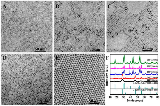 The crystal structure of NaYF4 typically consists of two forms, i.e., the cubic (α-) and the hexagonal (β-) phases. Since hexagonal NaYF4 UCNCs are able to offer about one order of magnitude higher UCL intensity than the cubic ones, we are interested in preparing ultrasmall NaYF4 UCNCs of β-phase [23,24]. In order to obtain small-sized β-NaYF4:30% Yb3+/2% Er3+, we prepared a set of nanocrystals using a co-precipitation method adapted from the literature [12], and explored the effect of reaction temperature on the crystal phase of the resulting nanoparticles. The nanoparticles were synthesized with a fixed ratio of Na+/Ln3+/F− of 2.5:1:4 in the growth solution, but at varied reaction temperature of 220–300 °C. The corresponding TEM images and XRD patterns of the as-prepared nanoparticles are compiled and shown in Figure 1. As one can see, at a low temperature of 220 °C, the as-prepared NaYF4:30% Yb3+/2% Er3+ UCNCs are uniform in size with a spherical shape, whose XRD pattern is in line with the standard cubic one of JCPDS 06-0342 (Figure 1F). For a temperature between 240 and 280 °C, the diffraction peaks of β-NaYF4 begin to appear and coexist with that of α-NaYF4, which is in agreement with the observation of depolarization of particle size (Figure 1B–D). At 300 °C, pure hexagonal NaYF4:30% Yb3+/2% Er3+ nanocrystals with a uniform size of ~8 nm have been achieved, as shown in Figure 1A,F. This result indicates that a high temperature favors the synthesis of pure hexagonal phase nanocrystals of a lower symmetry.