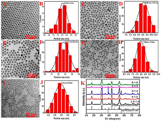 The formation of NaYF4:Yb3+/Er3+ nanocrystals typically includes two growth stages: nucleation and crystal growth. As the elemental nutrients of NaYF4 UCNCs, the amount of Na+ and F− plays a significant role in defining the size of the resulting nanoparticle by shaping the nucleation process [25,26,27]. To investigate the concentration effect of precursors on the resulting particle size, we synthesized a range of NaYF4:30% Yb3+/2% Er3+ nanocrystals at 300 °C with different ratios of Na+/Ln3+/F−. The corresponding TEM images and XRD patterns of samples are shown in Figure 2. As one can see, when increasing the NaOA content from 2.5 to 4 mmol (corresponding to an increase of Na+/Ln3+/F− from 2.5:1:4 to 4:1:4) and then to 6 mmol (corresponding to Na+/Ln3+/F− of 6:1:4), a gradual narrowing of the main XRD peaks at 30.7° and 42° is observed, indicating an increase in the size of the final products according to the Scherrer’s equation [27]. Indeed, this observation is consistent with the acquired results of TEM and size histograms, whereby the size is shown to increase from 8.0 to 12.7 nm (Figure 2A–F). Moreover, in addition to the diffraction peaks of β-NaYF4, the diffraction peaks of NaF are also observed at the ratios of Na+/Ln3+/F− of 4:1:4 and 6:1:4, being stronger for the latter with a higher dose of NaOA precursor. This result implies that an excessive NaOA content favors the formation of NaF byproduct, while the fluorine-deficiency in the growth solution leads to the formulation of large β-phase seeds, which accordingly mediate the growth of β-NaYF4:Yb/Er nanocrystals with large size. We reason that a simultaneous increase of Na+ and F− content in the solution can result in the production of small β-phase seeds, thus enabling the growth of final UCNCs with a reduced size. Indeed, as expected, the size of nanocrystals was decreased from 9.1 to 7.9 nm when the molar ratio of Na+/Ln3+/F− was elevated to be 5:1:5 (Figure 2G,H), and then to 5.4 nm when the molar ratio was further increased to 8:1:8 (Figure 2I–K). A simultaneous control of both the concentrations of NaOA and the NH4F precursors provides a simple method of producing monodisperse β-NaYF4:Yb3+/Er3+ nanocrystals with tailored sub-10-nm size, without the necessity of altering reaction time and temperature, as commonly employed in literature works [16,17]. In addition, due to surface-related quenching effects, the UCL intensity decreases with the decrement of particle size (Figure S1).