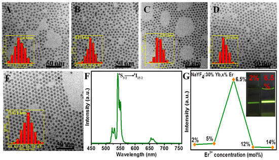 TEM images of NaYF4:30% Yb/x% Er (x = 2 (A), 5 (B), 6.5 (C), 12 (D), 14 (E)) nanocrystals prepared by using Na+, Ln3+, and F− in a ratio of 8:1:8 and reaction temperature of 300 °C (reaction time: 30 min). The corresponding histograms of size distributions of NaYF4:30% Yb/x% Er are shown in the inset of (A–E); (F) UCL spectra in the spectral range of 450–750 m for NaYF4:30%Yb/2% Er UCNCs under 980 nm laser diode excitation; (G) The dependence of integrated UCL intensity from 500 to 600 nm on the Er3+ concentration in NaYF4: 30%Yb/x% Er UCNCs. The inset in (G) displays recorded digital photos of UCL from NaYF4:30% Yb/2% Er and NaYF4:30% Yb/6.5% Er UCNCs excited at 980 nm.