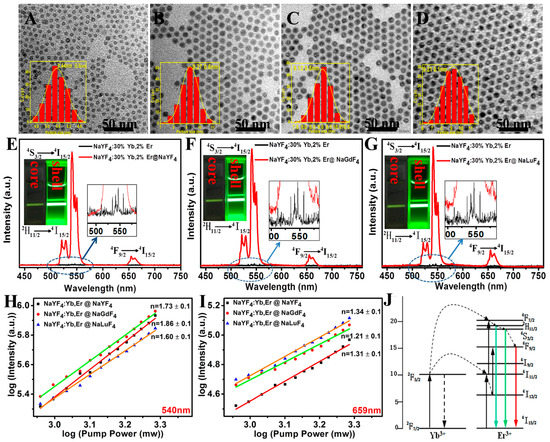 (A–D) TEM images and histograms of size distributions (inset) of NaYF4:30% Yb/6.5% Er, NaYF4:30% Yb/6.5% Er@NaYF4, NaYF4:30% Yb/6.5% Er@NaGdF4, NaYF4:30% Yb/6.5% Er@NaLuF4. All the core nanocrystals were prepared with the ratio of Na+/Ln3+/F− is 8:1:8 at reaction temperature of 300 °C; (E–G) UCL spectra from the core NaYF4:30% Yb/6.5% Er and the core–shell NaYF4:30% Yb/6.5% Er@NaYF4, NaYF4:30% Yb/6.5% Er@NaGdF4, NaYF4:30% Yb/6.5% Er@NaLuF4 UCNCs (hexane dispersion). The inset shows the corresponding UCL photographic images. Excitation at 980 nm, 100 W/cm2. Dependencies of emission band intensities at 540 nm (H) and 659 nm (I) on the incident laser pump power; (J) Schematic illustration of the proposed upconversion pathways between Yb3+ and Er3+ ions.
