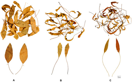 Photograph of Pyrrosiae Folium (A) Pyrrosia sheareri; (B) P. lingua; (C) P. petiolosa. (Upper: whole herb, Lower: unfolded leaf).