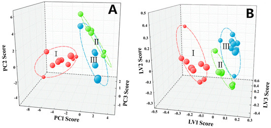 PCA and PLS-DA were carried out based on the content of five bioactive markers in 35 samples of PF representing different geographical regions of China, using STATISTICA 7.0 software (TIBCO Software Inc., Palo Alto, CA, USA). As for PCA, the first three principle components accounted for more than 90% of variance. As for PLS-DA, the data matrix performed a variable reduction on the dataset by calculating new variables (called latent components or factors) combining the variables in the dataset in order to find the maximum correlation between them and the class variable and, thus, the maximum separation among the classes. For an acceptance model, a high percentage of correct classification should be obtained.