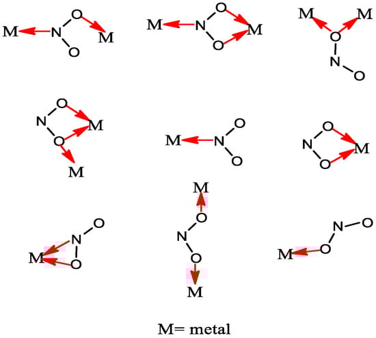 Linkage isomerism is of major interest in the field of inorganic chemistry can be used to develop new compounds with potential pharmaceutical applications in the field of biomedicine [5,6,7]. Linkage isomerism occurs when an ambidentate ligand (e.g., NO2, SCN, CNO, etc.) binds to the metal center [8,9,10]. Nitro-nitrito metal complexes can be regarded as good examples of linkage isomerism, which was first described by Jørgensen and further developed through the syntheses of [(NH3)5CoNO2]Cl2 and [(NH3)5CoONO]]Cl2 complexes by Werner [11]. It must be noted that the NO2 group can be coordinated to the metal atom in different ways such as nitro (via the nitrogen), nitrito (via oxygen), chelating via both oxygens (nitrito-O,O′), and bridging nitro, usually via nitrogen and oxygen atoms. It has been shown that the coordination mode of nitrite ion depends on its nature and the stereochemical environment which surrounds the metal ion [12,13,14,15]. Apart from the wide range of NO2 binding modes in mononuclear metal complexes, their potential tendency to act as bidentate ligand must be mentioned [16]. Various coordination modes of NO2 group are shown in Figure 1.