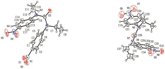 The symmetrical NO2-ligand (L) was synthesized by the reaction of n-Ethyl-4-nitro aniline and phosgene with a good yield (92%). A perspective view with the atom labeling of the ligand is given in Figure 2. In the X-ray crystallographic analysis, each unsymmetrical unit cell consists of two ligands (Figure 3).