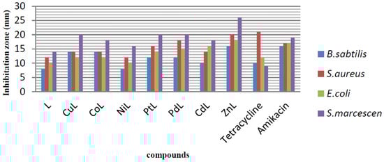 The in vitro antibacterial activities of the ligand, its metal complexes and standard antibiotic drugs were investigated using two Gram-positive bacteria (Bacillus subtilis and Staphylococcus aureus) and two Gram-negative bacteria (Escherichia coli and Serratia marcescens) by applying the disc diffusion and broth microdilution methods. The antibacterial activities of the ligand and all the complexes were compared to standard drugs (tetracycline and amikacin). The evaluation of antibacterial effect, conducted by measuring the diameter of growth inhibition, is shown in Figure 6, and the determination of minimum inhibitory concentration (MIC) is listed in Table 5. In general, the metal complexes displayed better inhibitory effect when compared to the ligand against all tested bacteria strains with zone inhibition in the range of 8–26 mm. Among all of the metal complexes, the compound with Zn transition metal showed highest antibacterial activities with the zone inhibition diameter ranging from 16 to 26 mm against both Gram-positive and Gram-negative bacteria strains, compared to the standard antibacterial drugs with the zone inhibition diameter ranging from 9 to 21 mm, as is evident in Figure 6. From the antibacterial results listed in Table 5, it can be seen that the ligand, its metal complexes and standard drugs (tetracycline and amikacin) showed different inhibition activities against various kinds of bacteria. Antibacterial activity of ligand against Bacillus subtilis showed less effectiveness with MIC value of 1000 µg/mL, whereas, against Staphylococcus aureus, Escherichia coli, and Serratia marcescens bacteria, showed better inhibition activity with similar MIC value of 500 µg/mL. Antibacterial activities of the seven kinds of complexes showed that majority of these complexes had effective activities against the bacteria strains. In general, the MIC of these complexes was better than that of the ligand and standard drugs. This phenomenon can be explained based on Tweedy’s chelation [21,22]. The chelation reduces the polarity of metal cation to some extent due to the overlap of the ligand orbital and partial sharing of the positive charge of the metal ion. The chelation increases the delocalization of p-electrons over the whole chelate ring and enhances the lipophilicity of the complexes which, in turn, increases the penetration of the complexes into lipid membranes, and results in blockage of metal sites in the enzymes of the microorganisms. In addition, metal complexes hinder the respiration process of the cell and, block the synthesis of proteins and prevent further growth of the organism. The highest inhibition activity against Serratia marcescens bacteria was observed for Zn-metal complex with MIC value of 31.25 µg/mL, followed by Pd-metal complex with MIC value of 62.5 µg/mL, which were 16-fold and 8-fold higher than the respective ligand. The MIC value for Zn-metal complex suggested that this compound had much stronger antibacterial activities (Table 5). It is evident from Table 5 that the changes in different metal complexes led to the changes of the activities against the used pathogenic strains. For metal complexes, the antibacterial activities against Bacillus subtilis increased in the order: Zn = Cd = Pd > Pt = Ni = Co = Cu. For metal complexes, the antibacterial activities against Escherichia coli increased in the order: Zn = Cd = Pd > Pt = Co = Cu > Ni. For metal complexes, the antibacterial activities against Serratia marcescens increased in the order: Zn > Pd > Cd = Pt = Co = Cu > Ni.