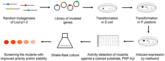 The directed evolution strategy of LXYL-P1–2 involves the random mutagenesis of Lxyl-p1–2 gene, followed by a screening or selection progress to screen or enrich for the variants with improved enzyme properties. In our previous study, we optimized the error-prone PCR conditions including the concentrations of Mg2+ and Mn2+ to control the mutation frequency, and also optimized the ligation efficiency of In-Fusion cloning method to obtain the recombinant plasmids efficiently [30]. The highest ligation rate was around 90% when the homologous length reached 100 bp, which was two to three times higher than those of the homologous length of 15 bp (recommended by the manufacturer’s instructions) and the conventional restriction and ligation method. Subsequently, the recombinant LXYL-P1–2 mutant library was successfully generated. PNP-Xyl can be hydrolyzed into xylose and p-nitrophenol, and the content of p-nitrophenol can be measured by the absorbance at 405 nm. Therefore, the activity of mutant enzymes of LXYL-P1–2 can be rapidly measured by using the chromogenic substrate PNP-Xyl. The mutated enzymes were expressed intracellularly in the recombinant yeasts [6,7,9], which allowed us to readily distinguish the change in enzymatic activity by monitoring the β-xylosidase activity of recombinant cells in vivo. Finally, based on the error-prone PCR coupled with a methanol-induced plate screening approach, two positive mutants—GS115-EP1 and GS115-EP2—with improved properties were selected (Figure 1).