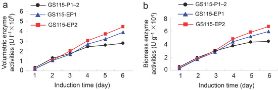 The two recombinant yeast strains GS115-EP1 and GS115-EP2 were cultured in a shake flask and the protein expressions were induced by methanol for five days. The volumetric enzyme activities and the biomass enzyme activities of the strains were determined as described previously [10]. As shown in Figure 2, with the increase of induction time, the volumetric activities and biomass activities of wild-type strain and mutant strains were increased. After induction by methanol for three days, the enzyme activities of GS115-EP1 and GS115-EP2 exceeded that of the wild type GS115-P1–2, of which the activity of GS115-EP2 increased more effectively. The volumetric activities of GS115-EP1 and GS115-EP2 were achieved 3.93 × 106 U L−1 and 4.45 × 106 U L−1, respectively, at the induction time of five days, which are increased by 40% and 59% compared with that of GS115-P1–2 (control) (2.8 × 106 U L−1). Similarly, the biomass activities of GS115-EP1 and GS115-EP2 reached 5.96 × 104 U g−1 and 6.71 × 104 U g−1, respectively, which are increased by 34% and 51% in comparison with that of the control (4.45 × 104 U g−1).