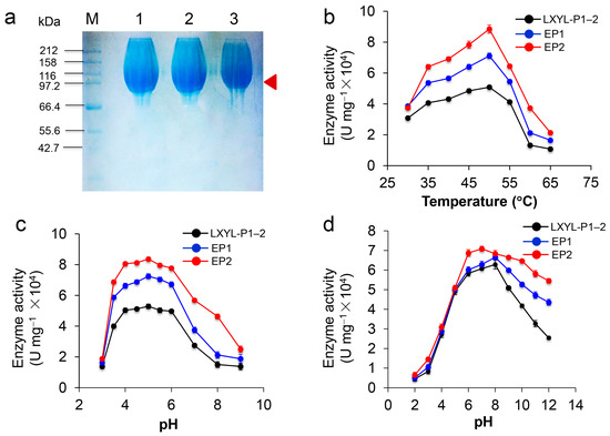 The recombinant proteins were purified by Ni-NTA affinity chromatography and gel column chromatography. SDS-PAGE analysis demonstrates that the purified recombinant LXYL-P1–2, LXYL-P1–2-EP1 (EP1), and LXYL-P1–2-EP1 (EP2) are highly glycosylated with molecular weights of 100–115 kDa (theoretical molecular weight is about 82 kDa), and each of them has a dispersion phenomenon in the electrophoresis band (Figure 3a). To explore the enzymatic activity of EP1 and EP2, the enzyme-catalyzed reactions were conducted at different temperatures and pHs. As shown in Figure 3b,c, similar to LXYL-P1–2, the optimum temperature of EP1 and EP2 against PNP-Xyl was 50 °C. The suitable reactive pH of the two enzymes ranged from 4.0 to 6.0, with an optimum pH of 5.0. Besides, the pH stability of EP1 and EP2 was further examined. After the enzyme was incubated in different buffers with pH ranging from 2.0 to 12.0 for 48 h, the catalytic reactions against PNP-Xyl were conducted at 50 °C, pH 5.0 for 20 min. The results showed that the enzyme EP1 was most stable at pH 8.0, which is similar to LXYL-P1–2, and the enzyme EP2 was most stable at pH 7.0. Moreover, both EP1 and EP2 were able to tolerate harsh alkaline conditions, retaining 77% and 63% of their highest enzyme activity after exposure to pH 12.0 for 48 h. In contrast, the wild type only retained 36% of its maximal activity under the same condition. The results showed that the tolerance of the two enzymes at pH 6.0~12.0 were higher than that of the control, of which EP2 was much more stable under the alkaline conditions (Figure 3d).