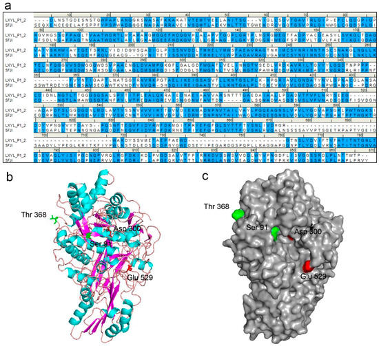The molecular structure of LXYL-P1–2 was predicted by molecular modelling (http://swissmodel.Expasy.org/). By a protein–protein BLAST, the GH3 β-glucosidase from Aspergillus fumigatus (Protein Data Bank code 5fji) is the most similar enzyme among the GH family, which exhibited 44% sequence identity and 59% sequence similarity to the glycoside hydrolase LXYL-P1–2. Therefore, it was selected as the template for LXYL-P1–2 homology modelling. The sequence alignment between LXYL-P1–2 and the template is shown in Figure 4a. Moreover, as shown in Figure 4b, the predicted structure of the wild type enzyme had the canonical three-domain structure feature belonging to the GH3 family. The N-terminal (α/β)8-barrel domain houses the nucleophile (Asp300) whilst the α/β-sandwich domain houses the catalytic acid (Glu529), which was supported by previous prediction and point mutation validation [7]. In addition, the single mutated amino acid in position 91 of the mutant EP1 is situated within the N-terminal domain, and closed to the nucleophile Asp300. In contrast, the mutation in position 368 of EP2 is located on the loop and at the surface of the predicted protein (Figure 4b,c). The T368E substitution increases the negative charge of the mutant protein, which may lead to the improved stability at a higher pH value.