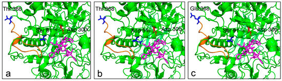 Molecular docking of wild type and mutants with XDT. XDT is shown in magenta. The nucleophile Asp300 is colored in red. The side chains of Ser91/Asp91 and Thr368/Glu368 are shown in blue. (a) Side view of LXYL-P1–2 with XDT, showing Ser91 and Thr368; (b) Side view of EP1 with XDT, in which Ser91 is replaced by Asp91; (c) Side view of EP2 with XDT, in which Thr368 is replaced by Glu368. The alteration of the loop near the active pocket is indicated in orange.