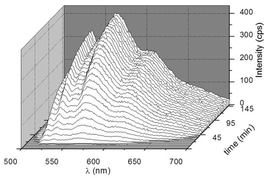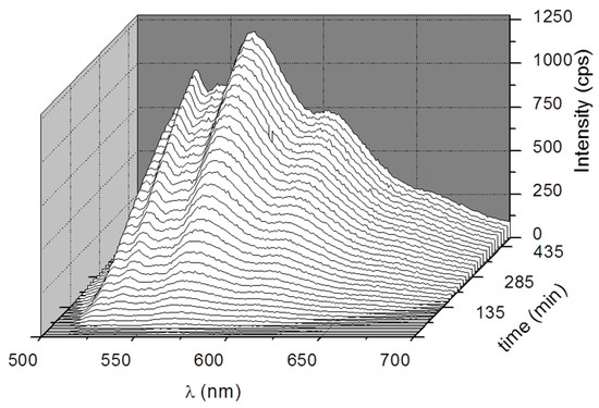 Emission spectra obtained from lipase hydrolysis of QDB 2.0 × 10−5 mol·L−1 in hexane as a function of reaction time (λexc = 484 nm, 20 mg of Novozym 435, T = 298 K).