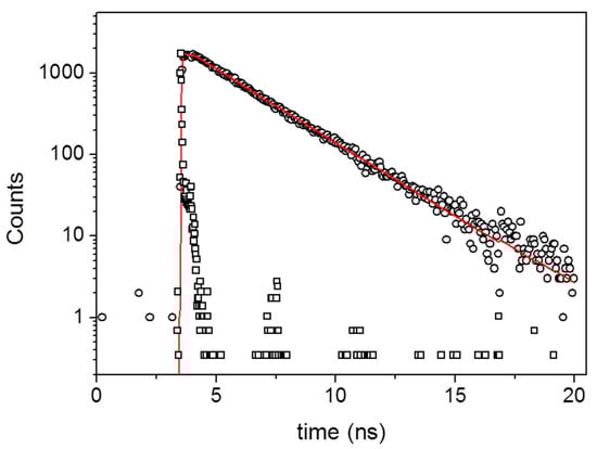 Fluorescence decay obtained from sample under lipase hydrolysis of QDA 2.0 × 10−5 mol·L−1 in hexane (λexc = 400 nm, λem = 550 nm, 20 mg of Novozym 435, T = 298 K). Fluorescence lifetime of 2.3 ns and fitting chi-square χ2 = 1.041.