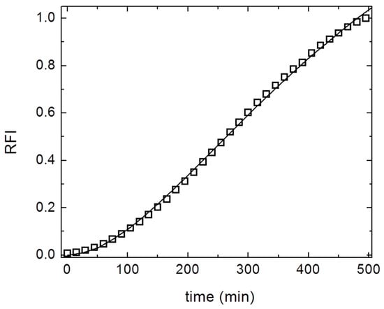 Relative fluorescence intensity (RFI) from integrated emission spectra obtained from lipase hydrolysis of QDB 2.0 × 10−5 mol·L−1 in hexane as a function of reaction time (λexc = 484 nm, 20 mg of Novozym 435). T = 298 K. The line is the fitting with the model given by Equation (1) (fitting quality evaluated by R2 > 0.98).