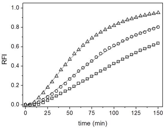 Relative fluorescence intensity obtained from lipase hydrolysis of QDA 2.0 × 10−5 mol·L−1 in 3 mL of decaline as a function of reaction time and amount of supported lipase added converted to enzyme mass (□) 0.7 mg, (○) 1.5 mg, (Δ) 2.2 mg. The line curves are the fitting of the data with Equation (1). λexc = 484 nm (fitting quality evaluated by R2 was always >0.98).