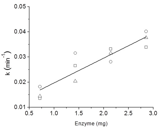 The change of k* with enzyme amount for QDA hydrolysis is plotted in Figure 10 for different solvent used. The empirical rate constant k* increases with the amount of added enzyme, with a similar behavior in the three nonpolar solvents. The lipase amount in the supported matrix was determined as 7.2% in weight. Such result was calculated by the CHN analysis of 1.2% of N in the solid samples and using the amino-acid composition of lipase with molecular weight of 33 kDa previously reported [34]. Using this information, it was possible to estimate the amount of enzyme in mg used in the experiments with different mass of supported lipase (Novozym® 435).