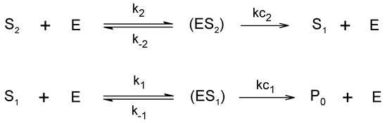 Enzymatic reaction mechanism with two sequential Michaelis-Menten steps.