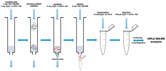 Extraction of betalains from blank samples and fortified blood plasma samples was carried out with the use of the StrataTM-X column (Phenomenex, 33 µm, Polymeric Reversed Phase, 200 mg/3 mL, Torrance, CA, USA). The first step consisted of a two-fold dilution of plasma sample (0.5 mL) in water with 0.05% FA (0.5 mL), vortexing by 1 min and centrifugation (Centrifuge 5427R, Eppendorf, Hamburg, Germany) for 10 min (14,000× g, 4 °C). Then, after conditioning the StrataTM-X column with a mixture of methanol/water (0.5/0.5, v/v, 1 mL) and 0.05% formic acid aqueous solutions (1 mL), the diluted plasma sample was loaded. Next, the column was washed with 2 mL of water with 0.05% FA, and betalains were eluted with 2 mL of 50% MeOH. The eluent obtained was evaporated to dryness with a stream of nitrogen at 30 °C and dissolved in 100 µL of water containing 0.05% FA. Before injection into the micro-HPLC-MS/MS, the solution was centrifuged (20 min, 14,000× g, 4 °C). The schema of the procedure is shown in Figure 1. Each sample was prepared in triplicate.