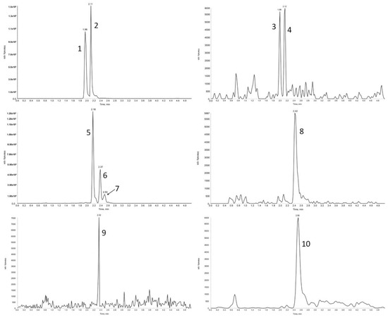 The micro-HPLC-MS/MS chromatograms of betalain compounds identified in the plasma samples (1—betanin; 2—isobetanin; 3—betanidin; 4—isobetanidin; 5—17-decarboxy-betanin; 6—17-decarboxy-isobetanin; 7—15-decarboxy-betanin; 8—neobetanin; 9—2,17-bidecarboxy-betanin; 10—2-decarboxy-neobetanin).