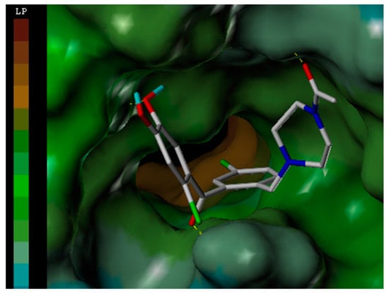 Compound 27a: Yellow solid, yield 79%, m.p. 56.0–58.0 °C; 1H-NMR (600 MHz, CDCl3) δ: 1.78 (s, 1H, piperazine-4’’-OH), 2.02 (s, 8H, piperazine-H), 2.47 (t, J = 5.4 Hz, 2H, piperazine-4’’-CH2-), 3.45 (s, 2H, Ar-2-CH2-), 3.56 (t, J = 5.4 Hz, 2H, HO-CH2-), 3.85 (s, 3H, Ar-4’-OCH3), 3.95 (s, 3H, Ar-5’-OCH3), 5.52 (brs, 1H, -OH), 7.06 (s, 1H, Ar-3’-H), 7.14 (s, 1H, Ar-6’-H), 7.28 (d, J = 7.8 Hz, 1H, Ar-3-H), 7.48 (d, J = 1.8 Hz, 1H, Ar-6-H), 7.53 (dd, J = 1.8, 7.8 Hz, 1H, Ar-4-H); ESI-MS m/z (%) 541.15, 543.18, 545.03 ([M + H]+, 60, 100, 70).