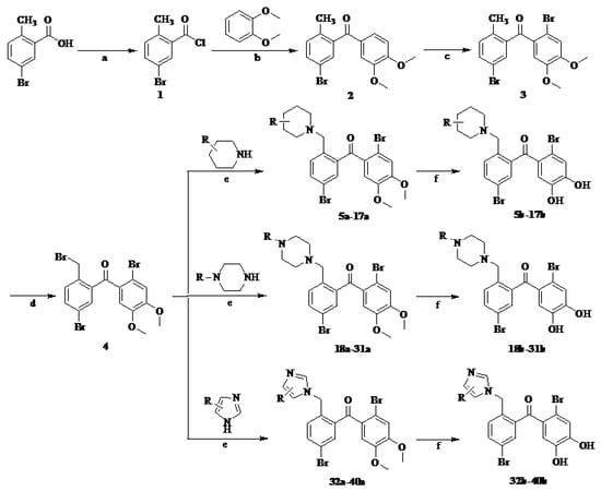 The intermediate 1 was prepared from 5-bromo-2-methyl benzoic acid with anhydrous SOCl2 dropped little N,N-dimethyl formamide (DMF) via acylating chlorination, then reacted with 1,2-dimethoxybenzene catalyzed by AlCl3 to yield intermediate 2. Aluminum chloride is an effective and cheap Lewis acid catalyst and is widely used in Friedel-Crafts acylation. Bromination reaction of intermediate 2 was quickly conducted with bromine to obtain the important compound 3 in acetic acid solvent at room temperature by electrophilic substitution in benzene ring, and was subsequently reacted with N-bromosuccinimide (NBS) to gain the key intermediate 4 in anhydrous CH2Cl2 using benzoyl peroxide (BPO) as the catalyst by free radical substitution. In this process, sunlight was beneficial to accelerate reaction velocity and shorten reaction time []. Compound 4 was treated with substituted piperidine, piperazine or imidazole in the presence of anhydrous Na2CO3 to prepare important intermediates 5a–40a. Then, 5a–40a were demethylated with BBr3 as the demethylation reagent in anhydrous CH2Cl2 at −78 °C to obtain target bromophenols 5b–40b in moderate to high yields.