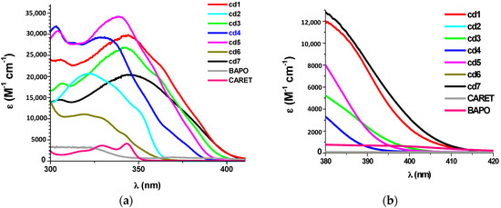 Absorption properties for Cd1–Cd7 vs. CARET and BAPO. (a) For short wavelength (300–400 nm); (b) for extended wavelengths, particularly between 380 and 415 nm.