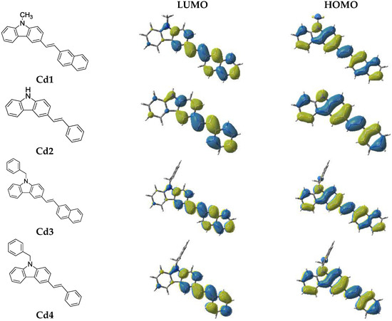 The ground state absorption spectra of the new proposed photoinitiators in dichloromethane (DCM) are shown in Figure 1 (see additionally Table 1). These compounds exhibit high molar extinction coefficients in the near UV (e.g., Cd7 ~20,500 M−1·cm−1 @345 nm and 1500 M−1·cm−1 @405 nm). Their absorptions in the 350–410 nm spectral range are interesting, guaranteeing a good overlap with the emission spectrum of the LED@405 nm used in this work. The optimized geometries and the frontier orbitals (Highest Occupied Molecular Orbital—HOMO and Lowest Unoccupied Molecular Orbital—LUMO) are shown in Figure 2. Both the HOMO and LUMO are firmly delocalized all over the π system clearly showing a π→π* lowest energy transition. The extension of the π framework by means of various substituents on the carbazole moiety causes a reasonable shift in the spectrum (e.g., the presence of 3-(1-naphthylethenyl) group causes a bathochromic shift in the spectrum of Cd7, Figure 1, and Table 1). A significant difference in the HOMO structure of Cd3 and Cd7 is also observed. The clear bathochromic shift caused by the different substituents in Cd1–Cd7 is consummately anticipated and it follows the following order: Cd7~Cd1 > Cd3 > Cd5 > Cd4 > Cd2 > Cd6. For the reference carbazole derivative (CARET), with no substituent on the phenyl rings, a shorter wavelength absorption is found as well as lower extinction coefficients (e.g., no absorption for CARET@405 nm vs. ε ~1500 (M−1·cm−1) for Cd7 see in Table 1). Surprisingly, contrasted with the well known photoinitiator (BAPO), the new proposed structures Cd1–Cd7 exhibit much better light absorption properties in all the 350–410 nm range (Figure 1).