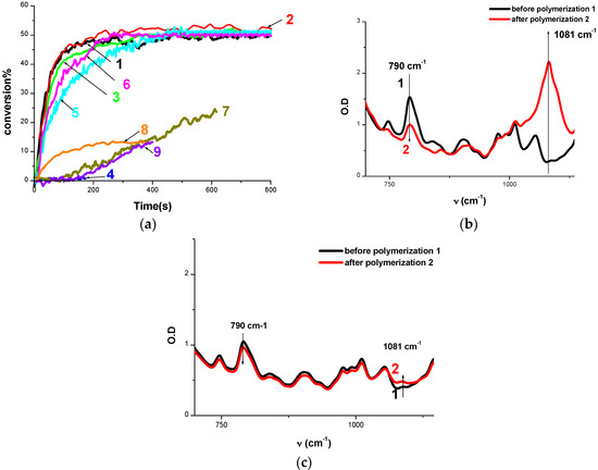 (a) Polymerization profiles of EPOX (epoxy function conversion vs. irradiation time) upon exposure to the LED@405 nm under air in the presence of different photoinitiating systems: (1) Cd7/Iod (0.5%/1% w/w); (2) Cd1/Iod (0.5%/1% w/w); (3) Cd3/Iod (0.5%/1% w/w); (4) Cd2/Iod (0.5%/1% w/w); (5) Cd4/Iod (0.5%/1% w/w); (6) Cd5/Iod (0.5%/1% w/w); (7) Cd6/Iod (0.5%/1% w/w); (8) BAPO/Iod (0.5%/1% w/w); (9) CARET/Iod (1%/1% w/w); IR spectra recorded before and after polymerization using: (b) Cd7/Iod (0.5%/1% w/w); (c) CARET/Iod (1%/1% w/w). The irradiation starts at t = 10 s.