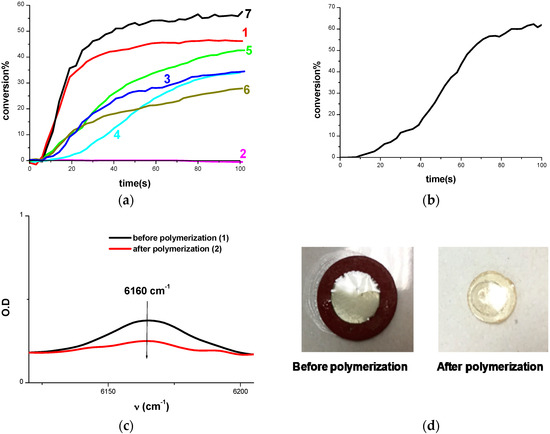 (a) Polymerization profiles of TMPTA (acrylate function conversion vs. irradiation time) in laminate upon exposure to LED@405 nm in the presence of: (1) Cd1/Iod (0.5%/1% w/w); (2) Cd2/Iod (0.5%/1% w/w); (3) Cd3/Iod (0.5%/1% w/w); (4) Cd4/Iod (0.5%/1% w/w); (5) Cd5/Iod (0.5%/1% w/w); (6) Cd6/Iod (0.5%/1% w/w); (7) Cd7/Iod (0.5%/1% w/w); (b) Polymerization profiles of BisGMA/TEGDMA (70%/30%) (methacrylate function conversion vs. irradiation time) (1.4 mm film thick sample) under air upon exposure to LED@405 nm in the presence of Cd7/Iod (0.5%/1% w/w); (c) Near IR spectra recorded before and after polymerization of BisGMA/TEGDMA using Cd7/Iod (0.5%/1% w/w); (d) Photos of BisGMA/TEGDMA film (1.4 mm thick) upon irradiation with the LED@405 nm for 100 s in the presence of Cd7/Iod (0.5%/1% w/w) under air before and after polymerization.