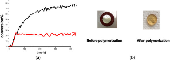 (a) Polymerization profiles of TMPTA/EPOX blend (acrylate and epoxy function conversions vs. irradiation time) under air thick sample 1.4 mm upon exposure to LED@405 nm in the presence of Cd7/Iod (0.5%/1% w/w): (1) TMPTA; (2) EPOX; (b) Photos of TMPTA/EPOX film (1.4 mm thick) upon irradiation with the LED@405 nm for 400 s in the presence of Cd7/Iod (0.5%/1% w/w) under air before and after polymerization.