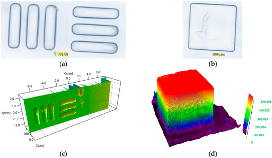 Cationic photopolymerization experiments using LED projector @405 nm: (a,b) patterns (c) Profilometry characterization for a thin pattern obtained (thin samples 0.02 mm); (d) observation (numerical optical microscopy) of pattern written in 3D for a thicker sample (0.5 mm).