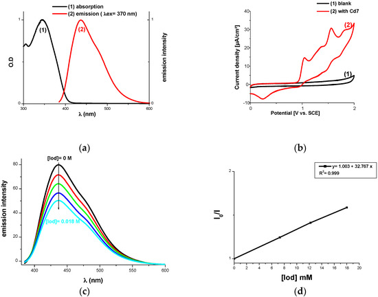 (a) Singlet state energy determination; (b) Cyclic voltammetry for the Cd7 oxidation; (c) Fluorescence quenching of Cd7 with Iod; (d) Stern-Volmer treatment of the lifetime quenching of *Cd7 in the presence of Iod.